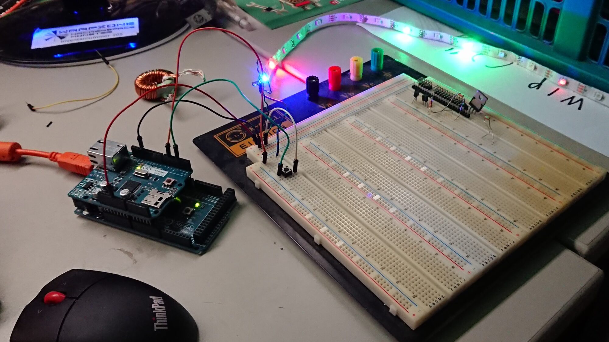 Ein vollkommen überdimensionierter Arduino MEGA 2560 (mit Ethernet-Shield) lag noch in einer Schublade. Dieser ist natürlich viel zu groß und leistungsstark für so ein primitives Projekt, zum Code und Hardware testen reicht es aber allemal. Für das fertige Produkt habe ich 3 Arduino nanos mit Atmega 328P bestellt. Diese sind hinreichend klein, dass er später in der Facker verbaut werden kann. LED Reste zum Testen würden sich bestimmt bei den warpzone-Mitgliedern abschnorcheln lassen.