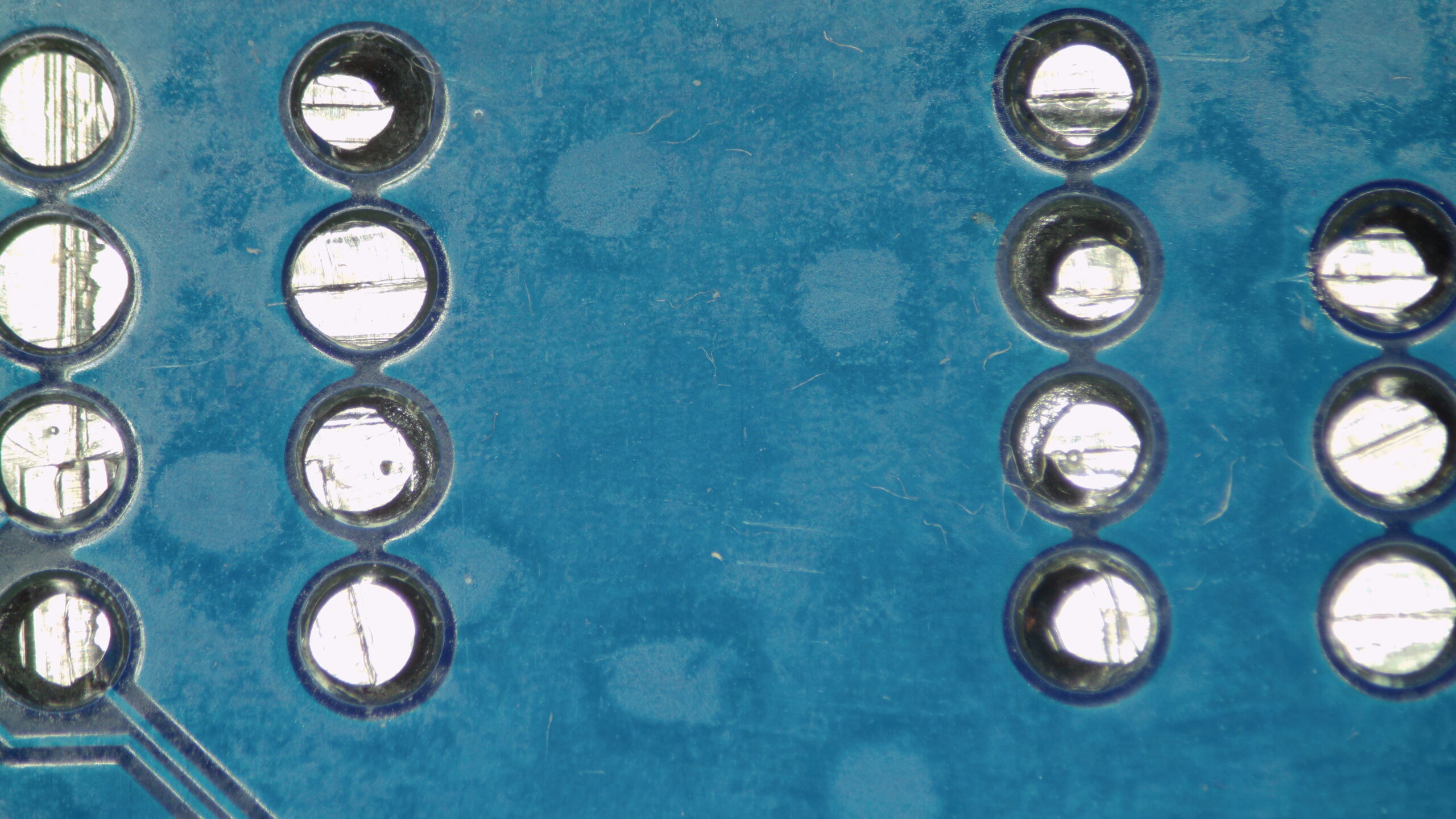 Bei der Arbeit ist mir aber noch ein Defekt an dem PCB aufgefallen. Hier scheint etwas während des Fertigungsprozesses drüber gerutscht zu sein, bevor die Lötmaske aufgetragen wurde. Eine Leiterbahn wurde dabei getrennt, 2 weitere leicht verformt. Ich habe die Bahnen freigelegt, mit einem Widerstandsbeinchen repariert und UV-härtende Lötmaske aufgetragen.