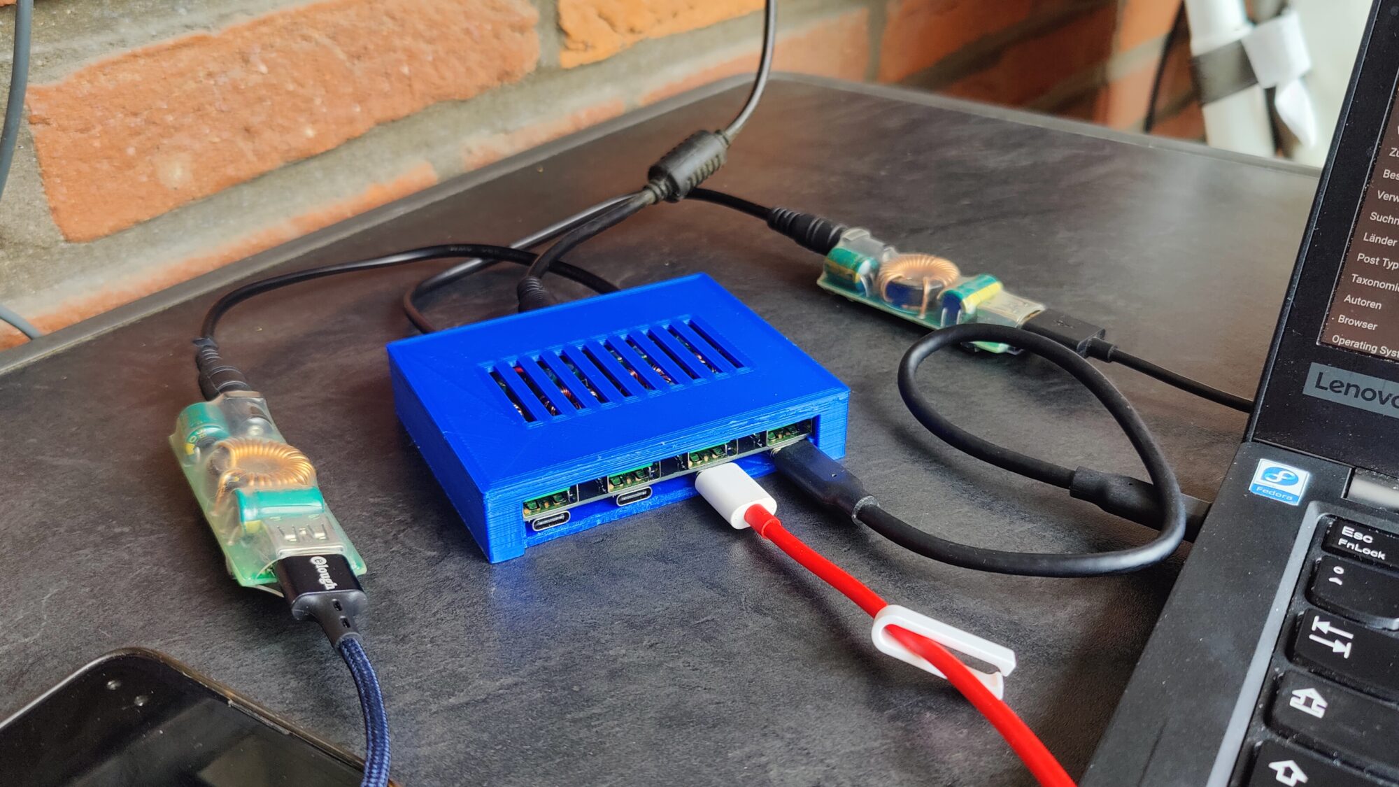 Strom kann man nie genug haben auf seiner Elektronikwerkbank. So ist mir neulich aufgefallen, dass dort Defizit an USB-C Buchsen vorherrscht, aus denen man ein Gerät mit mehr als 10 W betanken kann. Dafür habe ich bei AliExpress ein 4x USB-PD Stromversorungsboard gekauft, das ich mit 24 V versorgen kann und welches 5-20 V via USB-PD ausgibt. Außerdem beherrscht er so ziemlich alle verbreiteten USB-Ladestandards.
