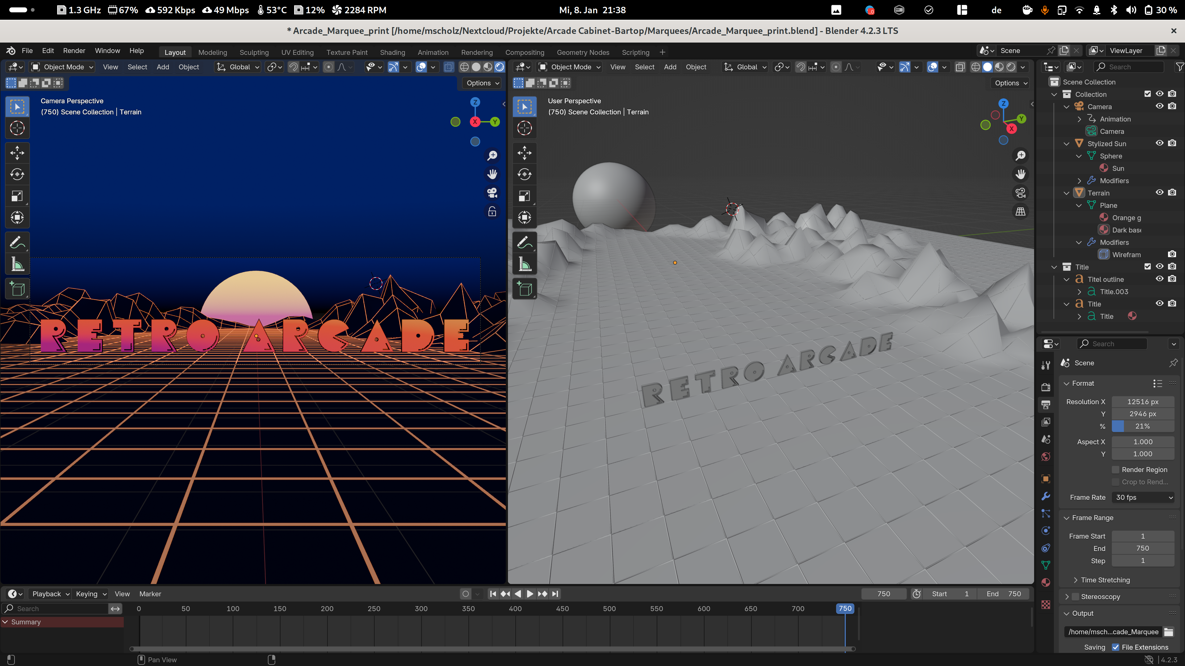 Für das Marquee, das beleuchtete Logo an der Kopfseite, habe ich eine einfache Szene in Blender zusammengeklickt. Angelehnt habe ich das Design an die 80er Jahre Wireframe Optik bekannt aus der Synthwave Musik dieser Zeit. Als Highlightfarbe verwende ich aber Orange, passend zum Korpus und komplementäres Lila.
