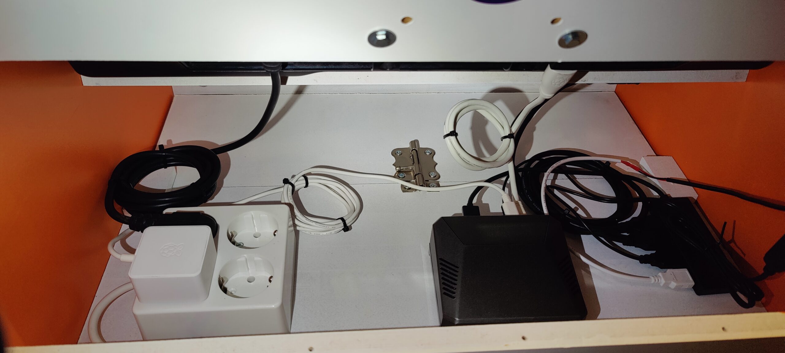 Die Stromversorgung habe ich eher einfach gehalten. 230V vom Stecker habe ich auf eine 4-Fach Steckdose aufgelegt. Der mitgelieferte Stecker mit Schalter, ist allerdings nicht isoliert. Hier muss ich definitiv noch eine Box als Greifschutz über die Stelle mit den blanken Kontakten montieren. In die Steckdosen kommen einfach das Monitorkabel und 2 USB Steckernetzteile. Damit wird die LED-Beleuchtung, der Audioverstärker und der Raspberry Pi betrieben.